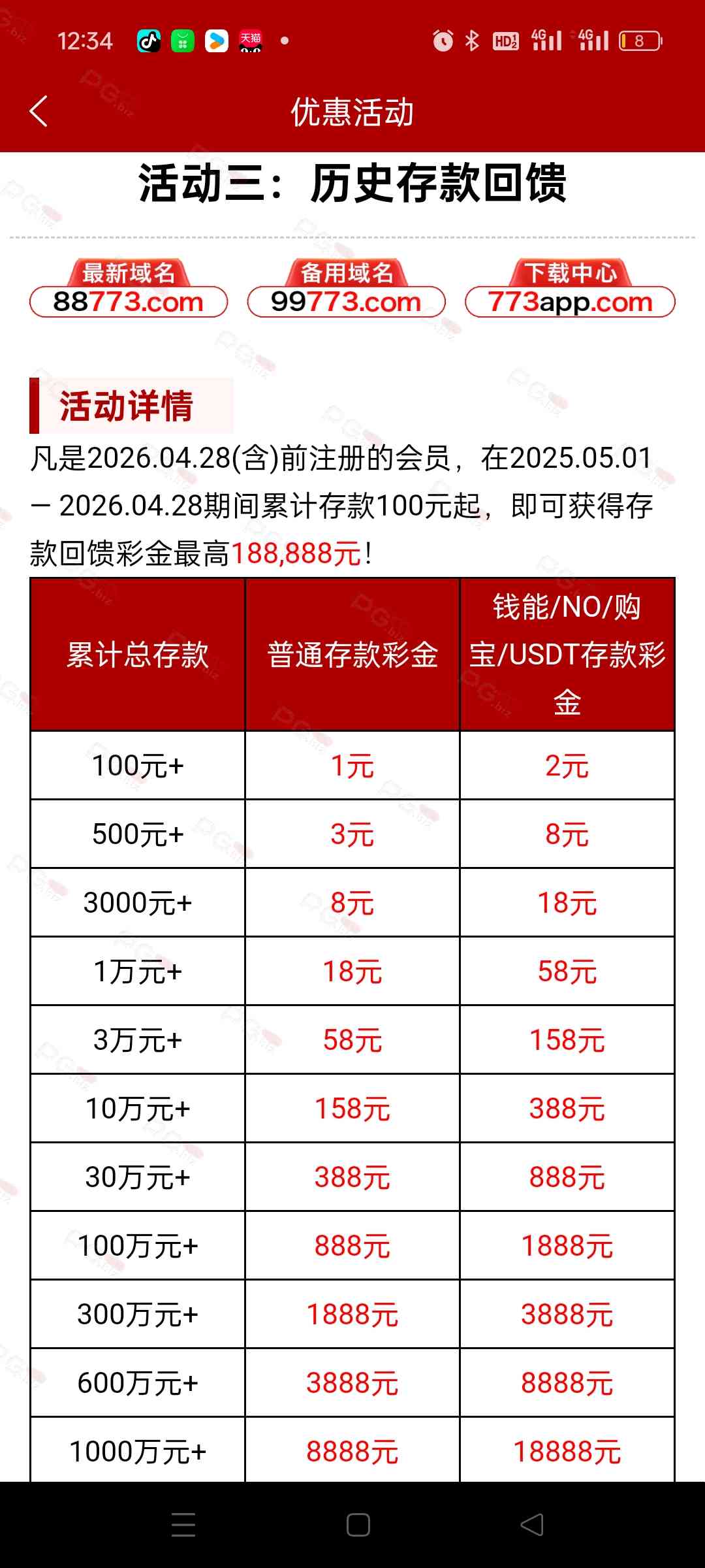 我发的这是773的其他的还没出来,应该差不多其他精彩系也是这样了,对比下春节回馈感觉差不多,一年总存3万也有158了,今年春节那波回馈才是坑,这次五一还算可以吧,比起其他平台回馈好很多了,773这个台这两年我经常白嫖几十上百块,还没输过,要输也是输在其他精彩系列的